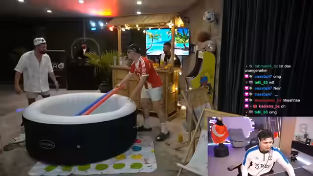 01:39:07Nach dem Twister-Spiel kündigen die Streamer an, auf Jamal B. Batman zu reagieren und am Ende ihre Meinung zum stärksten Song des Albums abzugeben. Sie beginnen mit dem Song 'Verlaufen' und äußern sich positiv über die verschiedenen Stilrichtungen und Features des Albums. Es wird festgestellt, dass bisher kein Song ein Flop ist, aber es persönliche Favoriten gibt. Plötzlich wird die Aufmerksamkeit auf einen Pool gelenkt und die Idee eines Pool-Streams entsteht. Die Streamer betonen, dass alles normal sei und nichts Anstößiges passiert. Sie scherzen über einen Jacuzzi-Poolstream und erwähnen, dass sie eine Yacht ins Studio bringen werden, was mit viel Aufwand verbunden ist. Es wird humorvoll darüber diskutiert, ob sie sich mit Socken und Schuhen in den Pool setzen sollen. Die Ankündigung des Pool-Streams sorgt für Aufregung und Neugierde im Chat.