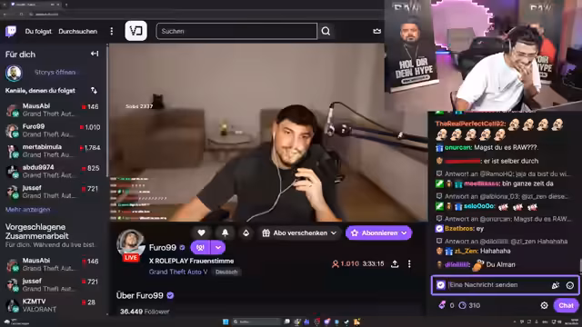 03:56:40Der Streamer steckt in einer schwierigen Situation, da er vor einer Tür gefangen ist und sich nicht befreien kann. Er bittet um Unterstützung, während gleichzeitig Ideen für eine Rollenspiel-Szene mit Rommel besprochen werden. Es wird vorgeschlagen, Samira zu Rommel zu bringen und sich dort zu entschuldigen, was als interessantRP-Szene beschrieben wird. Parallel dazu werden technische Probleme mit der Sprachqualität angesprochen, bei der einige Teilnehmer leise und andere laut wahrgenommen werden.