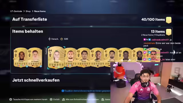 04:19:25Es wird auf ein neues Instagram- und TikTok-Video zur Raw Season hingewiesen und um Unterstützung gebeten. Nach dem Reingepayen von 500 Euro in 12.000 FIFA Points, werden Promo-Packs im Shop geöffnet, wobei die bisher teuerste gezogene Karte einen Wert von etwa 70-80k hatte. Trotzdem bleibt das Ergebnis der Packs durchwachsen, es werden zwar einige brauchbare Spieler wie Sanchez (10k Wert) gezogen, aber viele sind wertlos. Es wird überlegt, ob man die gezogenen Spieler über Nacht zum Verkauf anbieten soll. Der Streamer zieht viele weibliche Spieler, aber keine besonders guten. Nach dem Öffnen von untradable Packs und dem Umtauschen von Spielern werden weitere Packs geöffnet, jedoch ohne nennenswerte Erfolge. Der Chat wird nach seiner Meinung gefragt, ob bei schlechten Ergebnissen 50 Subs an Clarissa geschickt werden sollen. Ein untradeable Pack wird geöffnet, aus dem Mondi gezogen wird, was als positiv bewertet wird. Nach weiteren erfolglosen Versuchen wird überlegt, ob die Packs einen Bug haben, da ständig weibliche Spieler gezogen werden.