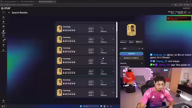 05:06:39Im Hintergrund läuft die finale Planung für RAW, wobei ein Bomben-Team sich um alles kümmert. Es wird bekannt gegeben, dass die Jury-Bekanntgabe vernünftig und groß gemacht wird, ohne Leaks. Nach dem Öffnen von Pre-Order-Packs, die sich als Fehlinvestition herausstellen, da der Streamer die Vorbestellfrist verpasst hat, beginnt der Streamer mit dem Aufbau eines neuen Teams. Er verlässt Ultimate Team, um sich bei der Web App anzumelden und Spieler zu kaufen. Nach einem Anruf bei BZ erhält er die notwendigen Daten. Es wird eine Frage aus dem Chat beantwortet, ob man trotz Ausbildung oder Arbeitsvertrag an RAW teilnehmen kann, was bejaht wird. Der Streamer empfiehlt jedoch, die Ausbildung nicht abzubrechen. Der Streamer füllt den Transfermarkt mit 100 Spielern und verkauft Saka und Konate. Er erreicht einen Kontostand von einer Million Coins und beginnt mit dem Aufbau seines Dream Teams. Der Chat wird nach Aufstellungsvorschlägen gefragt, wobei 4-4-2 als gute Option genannt wird. Der Streamer ändert Club Manager und Stadion ingame.