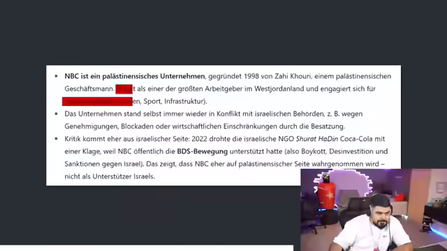 00:09:15Es wird auf KuchenTVs Video reagiert, in dem die Doppelmoral von Mert und Bilal kritisiert wird, die wegen der Coca-Cola-Partnerschaft aus der Icon League ausgetreten sind. KuchenTV wirft ihnen vor, dass sie nicht konsequent boykottieren, da sie weiterhin bei DAZN arbeiten, die ebenfalls mit Coca-Cola kooperieren. Es wird argumentiert, dass Merts Entscheidung, aus der Icon League auszusteigen, seine eigene sei und dass er nicht für frühere Handlungen kritisiert werden sollte. Die Problematik der Coca-Cola-Abfüllanlage im Westjordanland und die damit verbundene Unterstützung Israels wird thematisiert. Es wird darauf hingewiesen, dass Coca-Cola schon lange mit der FIFA und der UEFA zusammenarbeitet und dass Mert auch bei der EM 2024 Coca-Cola unterstützt hat. Die Doppelmoral wird weiter ausgeführt, indem auf Merts Markenbotschafterrolle bei Oktagon hingewiesen wird, deren Sponsor Monster Energy teilweise Coca-Cola gehört. Abschließend wird die Entscheidung von Mert als peinlich und als Ausnutzung des Leids der Palästinenser zur Verbesserung des eigenen Rufs kritisiert.