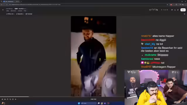 03:33:33Der Stream reagiert auf die letzten beiden Raw-Bewerber, die aufgrund von Upload-Problemen als separate Videos eingereicht wurden, aber ein Duo bilden. Die Bewerber werden als interessant befunden, obwohl die Masken als störend empfunden werden. Der zweite Bewerber wird sogar als stärker eingeschätzt. Es wird versprochen, dies mit BZ zu besprechen, um eine mögliche Integration in das Raw-Projekt zu prüfen. Nach Abschluss der Bewerberrunden wird das Spiel 'Erkenne die Knastbräute' von Naim Sky gespielt. Eine Kandidatin wird sofort als nicht passend identifiziert, da sie kürzlich in einem Musikvideo von Kurdo zu sehen war. Die erste Kandidatin erzählt eine 0815-Geschichte über Totschlag, der durch eine Schlägerei nach einer Belästigung auf einer Silvesterfeier entstand.