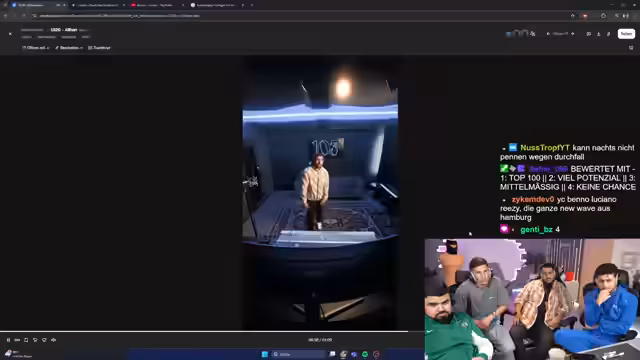 01:15:09Die Streamer beginnen mit der Bewertung von musikalischen Bewerbern für ein 'Top 100'-Format, ähnlich einer Castingshow. Der erste Bewerber, Neza Fee, wird als solide, aber nicht besonders originell eingestuft, was zu einer Empfehlung führt, 'drüber zu sprechen'. Asche vergleicht ihn stilistisch mit den Rappern Haaland und Salik. Der nächste Bewerber, Abdel Off, wird als sympathisch, aber unpassend für das Format angesehen, da er an Jakari erinnert. Es wird festgestellt, dass das Genre zwar gut ist, aber nicht gut bedient wird. Der dritte Bewerber, Redas, bewirbt sich bereits zum dritten Mal, was zu einer Diskussion über das Preis-Leistungs-Verhältnis der Bewerbung führt. Sein Auftritt wird als nicht überzeugend eingestuft. Der vierte Bewerber, Cäsar, wird aufgrund der schlechten Produktion seines Songs kritisiert. Der fünfte Bewerber, Kalash 315, wird für sein Ende gelobt, das an Sulking erinnert, aber der Rest des Songs wird als zu einfach und nicht durchdacht kritisiert. Insgesamt wird festgestellt, dass bisher keiner der Bewerber wirklich überzeugt hat.