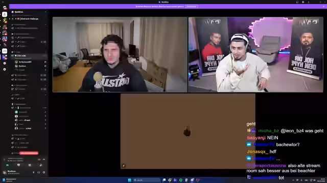 01:22:59Der Stream wechselt zu einem interaktiven Community-Format. Im Discord wird die "Nicht-Lachen-Challenge" gestartet, bei der Zuschauer Witze erzählen müssen. Ziel ist es, dass die Streamer Bachelor und der Moderator nicht lachen; gelingt es dem Bewerber, spenden sie 50 Euro. Das Format führt zu humorvollen Missverständnissen, zum Beispiel beim Witz "Wie heißt ein Rumäne, der Trauben isst?", der aufgrund von Sprachbarrieren nicht verstanden wird. Die Atmosphäre ist lockert durch interaktive Einlagen und absurde Witze.