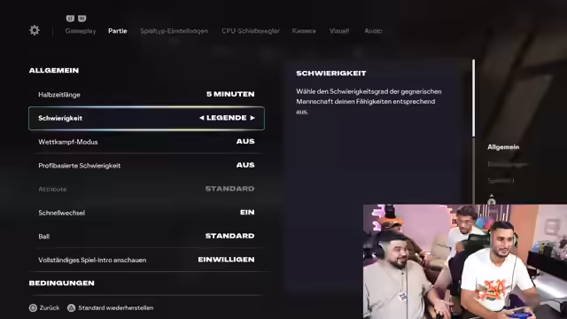 01:39:57Es wird die Unfairness des Matchups zwischen Baris und BZ betont, da BZ als starker FIFA-Spieler gilt. Es wird die Frage aufgeworfen, ob ein Aufwärmspiel gemacht werden soll, da einige Teilnehmer noch nie FIFA 26 gespielt haben. Es wird diskutiert, ob der Verlierer des Spiels vor oder nach dem Spiel am Glücksrad drehen soll, um die Bestrafung zu ermitteln. Es wird eine Abstimmung im Chat gestartet, um zu entscheiden, wann gedreht werden soll. Letztendlich wird beschlossen, dass nach dem Spiel gedreht wird. Die Halbzeit wird auf fünf Minuten eingestellt. Es wird bekannt gegeben, dass Real Madrid gegen Barca spielt und die Zuschauer auf den Ausgang des Spiels wetten können. Es wird nach den Werten bestimmter Spieler gefragt, um die Qualität des Teams einzuschätzen. Abschließend wird über die Schwierigkeit diskutiert, 1000 Starler zu erreichen und der Wunsch geäußert, ein Gamer zu sein.