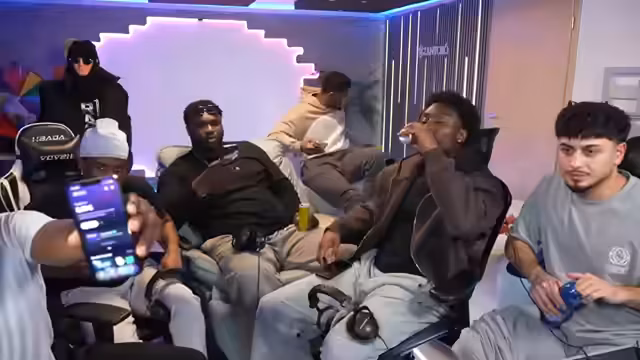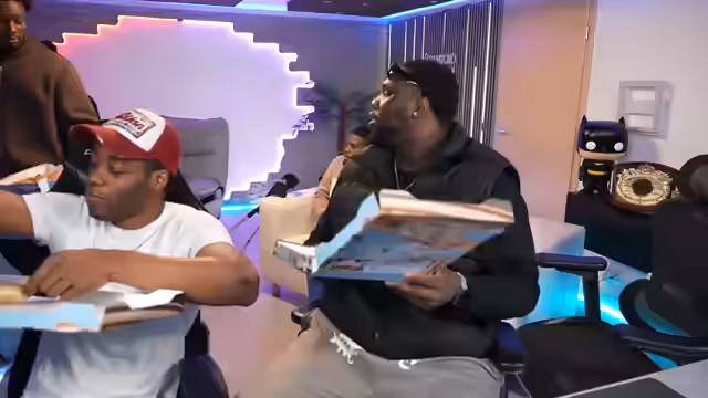 00:54:10Nach dem Start der Formaten wird mit dem Essen der bestellten Pizzas begonnen. Es kommt zu einer lockeren und teils chaotischen Runde, bei der sich die Streamer und Gäste gegenseitig necken und über private und alltägliche Themen sprechen. Etty, der ursprünglich nicht kommen wollte, wird wegen seiner Verletzung und seines Verhaltens auf die Schippe genommen, was zu humorvollen Auseinandersetzungen führt.