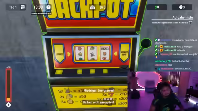05:03:41Der Streamer spielt 'Prison Escape Simulator' und versucht, aus seiner Gefängniszelle zu entkommen. Er sammelt Gegenstände wie Toilettenpapier, Stiefel und eine Seife, um sie zu verhandeln oder zu nutzen. Er interagiert mit anderen Insassen und dem Wärter, handelt Gegenstände und arbeitet an seiner Grab-Aktion. Während des Spiels benötigt er ständig Energie, die er durch Essen oder Mittagspause auffüllen muss. Das Gameplay ist geprägt von Verhandlungen, dem Verwalten von Ressourcen und dem zielgerichteten Graben.