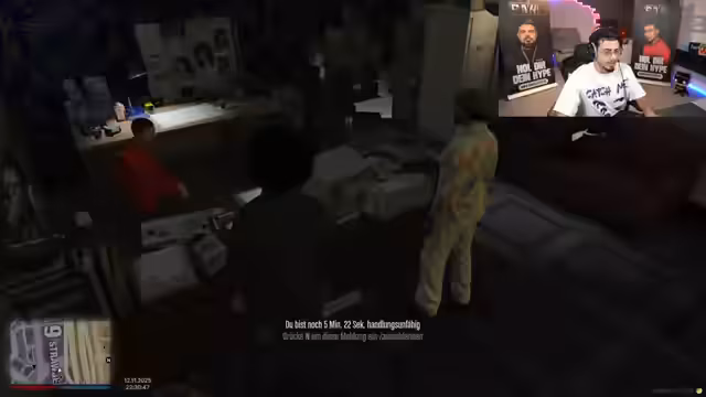 03:07:08Nach einem Schlag ins Gesicht, der von einem Mann in Boxershorts ausgeführt wurde, wird der Streamer von den Ereignissen überrollt. Er beschwert sich über ein unbegründetes Ausreiseverbot und fordert eine Beschwerde. Die Situation eskaliert weiter, als er um Hilfe ruft und Geld fordert. Inmitten des Chaos wird er von einem Officer James gekündigt und äußert seinen Frust über seine erneute Arbeitslosigkeit. Die Diskussion dreht sich um persönliche Angriffe und die Schwierigkeit, in dieser chaotischen Umgebung einen klaren Kopf zu bewahren.