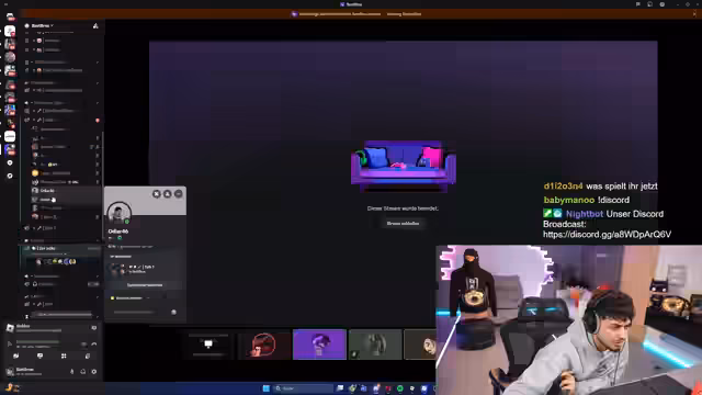 09:04:15Die Erschöpfung der Teilnehmer nimmt zu ('neun Stunden Spielzeit'), Diskussionen werden repetitiv ('Chat ist müde'). Ein Spieler verlässt den PC und beschreibt privat einen ungewöhnlichen Bäckerbesuch: In voller Arbeitskleidung (Engelbert-Strauß-Jacke, Stahlkappenschuhe) bestellte er Tiefkühlbrötchen, was von anderen als 'Junkie'-Verhalten kommentiert wird. Der Stream endet mit Weihnachtsgrüßen, der Ankündigung zukünftiger Streams ('morgen Abend wieder') und dem Hinweis auf ein Giveaway ('5 Subs').
