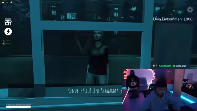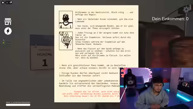 03:00:37Nach technischen Hürden beim Login und Verbindungsaufbau starten sie das Spiel. Sie stellen fest, dass es um einen Dönerladen in Nachtarbeit handelt mit speziellen Regeln: Bestimmte Anomalien dürfen nicht bedient werden, bei Gesichtslosen muss das Fenster geschlossen werden, und jeden Freitag um 2 Uhr morgens kommt eine Inspektion. Sie interagieren mit den ersten Kund*innen und versuchen, die Regeln zu befolgen, während ungewöhnliche Ereignisse wie plötzliche Dunkelheit auftreten.