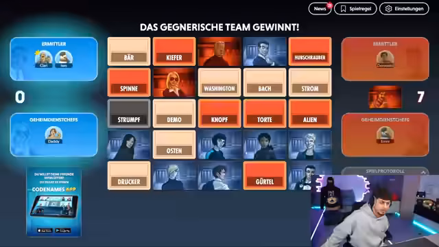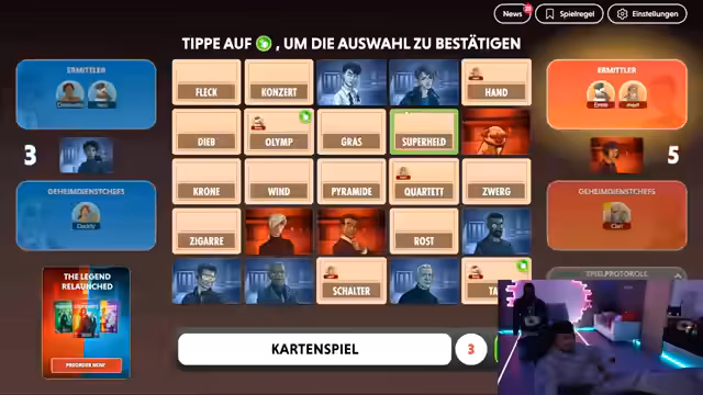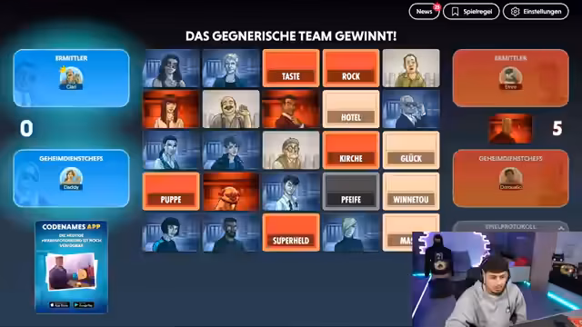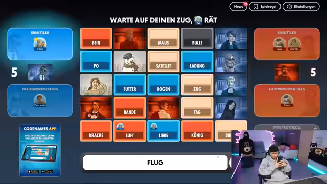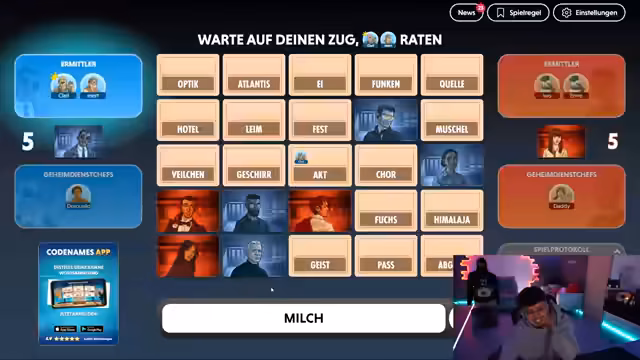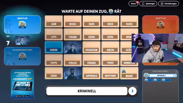 06:46:12Die Regeln des Spiels werden detailliert erklärt: Spieler müssen Wörter erklären, während der Partner raten muss. Es gilt, nur rote und beige Wörter zu nutzen, blau und schwarz sind verboten. Clarissa wird als Spielleiterin eingeführt, und es folgen erste Spielrunden. Der Streamer und seine Teamkollegen diskutieren Strategien, etwa wie man Wörter kombiniert (z.B. 'Winter' für 'Schnee, Eis, weiß'). Technische Aspekte wie Sprachumstellung auf Deutsch werden behandelt, und die Teilnehmer werden angehalten, ihre Bildschirme nicht zu zeigen, um Cheating zu vermeiden.