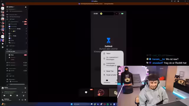 00:54:22Ein großes und spontanes Teilformat des Streams ist die 'Handys-Kontrolle' von freiwilligen Zuschauern. Der Streamer zieht Teilnehmer in einen Talk-Raum, um deren Handys (unter Einhaltung der Privatsphäre) live zu inspizieren und die App-Nutzung zu hinterfragen. Dies soll lustige Momente und maximale Clip-Produktion generieren. Die Teilnahme ist freiwillig, und es wird explizit darauf hingewiesen, dass die erstellten Clips ebenfalls für das Gewinnspiel qualifizieren, was zur Clip-Flut beiträgt.
