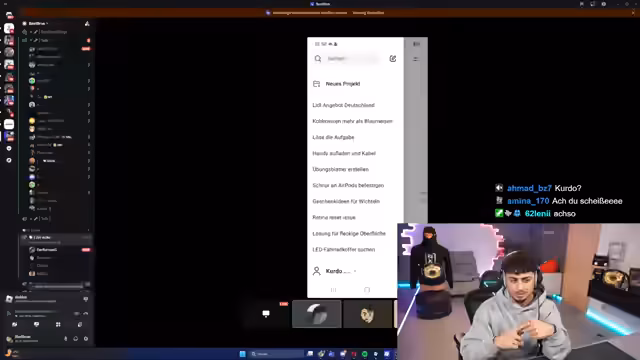 02:44:39Jamal nimmt mit Walid als Begleiter an der Handy-Kontrolle teil. Sie übertragen den Bildschirm auf Snapchat, um Jamal's Galerie und privaten Bereich zu zeigen, darunter ausgeblendete Fotos und Familienbilder. Walid moderiert die Session, um Leaks zu verhindern, während Jamal betont, dass sein Profil 'clean' ist. Die Gruppe durchsucht seine Sammlungen und App-Nutzung, wobei sie seine Sauberkeit in sozialen Medien bestätigen und über Jugendschutz diskutieren.