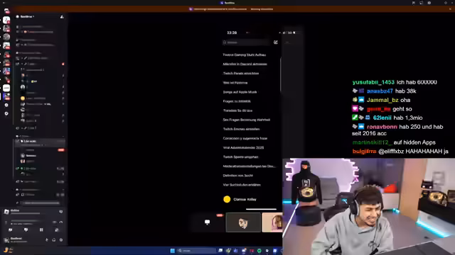 01:40:26Nach Clarissa werden Emir und Kurmanji als weitere Freunde des Streamers eingeladen. Emir präsentiert seinen Snapchat-Score und seine Safari-Tabs, erklärt seinen Handy-Wechsel und zeigt, wie er seine Verläufe verwaltet. Bei Kurmanji werden WhatsApp-Gruppen und die Kommunikation mit der Fahrschule überprüft, wobei persönliche Nachrichten und private Chats diskutiert werden. Die Interaktionen erzeugen Lacher im Chat, während die Gruppe die Sauberkeit der Profile bewertet.