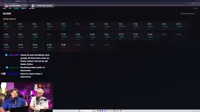 02:44:04Diskussion über die Aufstiegschancen in der 3. Liga. Der Streamer äußert seine persönlichen Wünsche bezüglich des Aufstiegs, da er Vereine wie Rot-Weiss Essen, FC Carl Zeiss Jena oder MSV Duisburg in höheren Ligen sehen möchte. Gleichzeitig wird betont, wie schwer es ist fundierte Vorhersagen für die 3. Liga abzugeben, da das Wissen über die aktuelle Situation dort weniger ausgeprägt ist. Dennoch werden verschiedene Szenarien durchgesprochen und favorisierte Teams genannt.