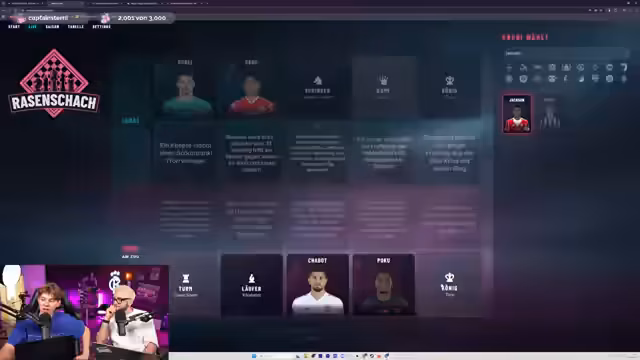 01:14:57Ein weiteres Format des Rasenschachs vorgestellt: die Springer-Kategorie. Dabei kann ein Spieler ausgewählt werden, und bei einem Sieg seines gesamten Vereins werden drei Punkte, bei einem Unentschieden ein Punkt vergeben. Die Teilnehmer diskutieren über verschiedene mögliche Spieler und analysieren deren Chancen. Es werden auch gesperrte Spieler aufgeführt und diskutiert, welche Alternativen es gibt. Besonders spannend ist die Auswahl der richtigen Spieler in verschiedenen Kategorien: Springer, Dame, König, Läufer und Turm. Die Teilnehmer müssen taktisch vorgehen und genügend Bayern-Spieler berücksichtigen, da einige Top-Spieler gesperrt sind und nicht zur Auswahl stehen.