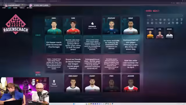 01:36:19Die Teilnehmer treffen ihre endgültigen Entscheidungen für die Spieler-Auswahl im Rasenschach. Die Kategorie Springer wird mit Schabot auf einen Sieg von Stuttgart getippt. Als Torwart ohne Gegentor wird Gregor Kobel vom BVB gegen Freiburg ausgewählt. Für die Kategorie Dame wird Ernest Poku ausgewählt, der ein Tor oder eine Vorlage gegen Bayern erzielen soll. Bei König entscheidet man sich für Dennis Undaf gegen Bremen. Für Läufer wird Engelhardt gegen Gladbach nominiert, als Turm Van der Voort vom HSV. Die Auswahl fiel nicht leicht, da viele Spieler verletzt oder gesperrt sind, besonders Bayern-Stars. Die Teilnehmer rechnen ab und setzen auf ihre getroffenen Vorhersagen.
