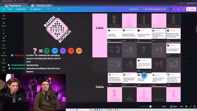 00:56:18Nach Abschluss des Blind-Rankings wechselt der Stream nahtlos zum nächsten Segment, Rasenschach. Die Jackson-Irvine-Thematik aus dem Chat wird kurz angesprochen, aber als zu emotional und zu weit ausufernd eingestuft, um sich darauf zu konzentrieren. Es folgt die Begrüßung für Spieltag 11 von Rasenschach, bei dem wiederum Niklas Levinson anwesend ist. Zuerst gibt es jedoch eine kurze Auswertung der Ergebnisse des vorherigen Spieltags.