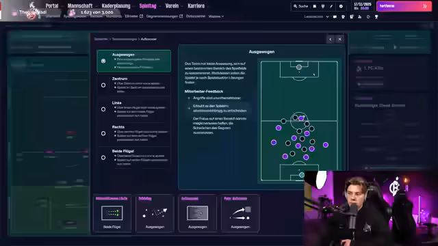 01:45:06Die geplante Taktik ist ein flexibles System mit Fokus auf Konter und langen Bällen auf den Zielspieler Ragnar Ache. Nach anfänglichen Schwierigkeiten wird eine Grundauswahl von Rollen erstellt. Die Startelf orientiert sich stark an der Realität mit Marvin Schwebe im Tor, Vandenberg in der Innenverteidigung und El Mala im linken Halbraum. Spieler wie Bülter werden wegen ihrer Einsatzfreude bevorzugt, während Meiner als Tempo-Reserve auf der Bank sitzt.