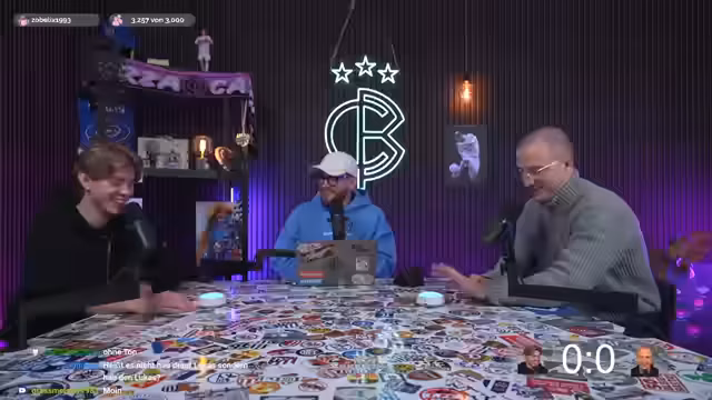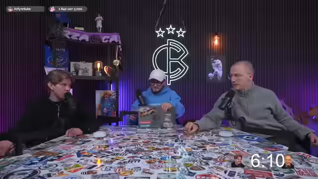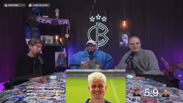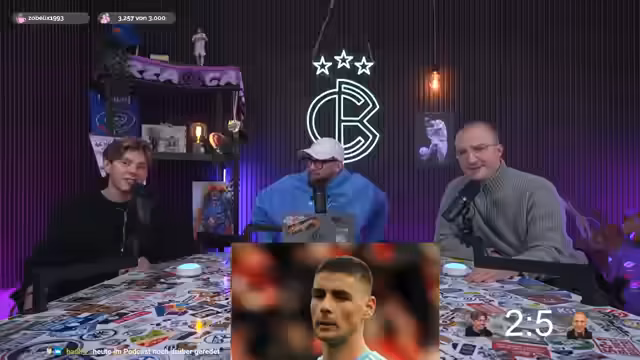 00:48:00Anschließend wird Christoph Kröger als dritte Person in das Studio geholt. Ein interaktives Quiz steht auf dem Programm, bei dem Lukas und Niklas gegeneinander antreten. Der Quizmaster ist Christoph Kröger. Es geht um das Erkennen von Fußballpersönlichkeiten anhand von Porträtfotos. Die Regeln sind klar: Wer zuerst per Buzzer buzzt, muss sofort antworten. Eine richtige Antwort bringt einen Punkt, eine falsche zieht einen Punkt ab. Die Atmosphäre ist von Späßchen und Wettkampf geprägt. Christoph hat das Quiz vorbereitet und wird von Lukas beschuldigt, es extra gegen ihn 'hategepickt' zu haben, also mit schwierigen Spielern ausgestattet zu haben. Niklas startet sehr stark und kann die ersten drei Fragen korrekt beantworten und damit in Führung gehen.