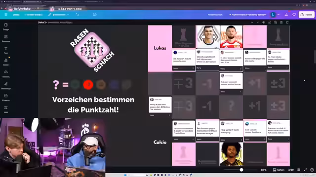 01:50:27Es kam zu einer deutlichen Meinungsverschiedenheit bei der Interpretation des 'Minus-plus drei'-Feldes. Niklas hatte fälschlicherweise eine These auf das Plusfeld gesetzt, während Lukas konsequent darauf bestand, dass nur eine negative These für Pluspunkte sorgt. Dies führte zu einer hitzigen, aber humorvollen Debatte. Beide versuchten, die wahrscheinlichste These für ihr Team zu finden, während sie gleichzeitig die 'Minus-Drei'-Option mit den unwahrscheinlichsten Ereignissen belegten, wie ein Torwart-Scorer.