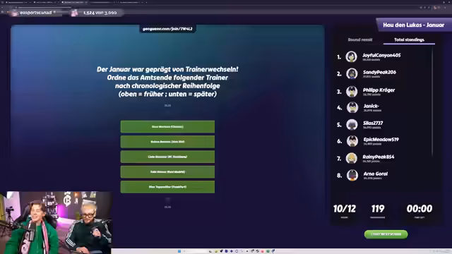 03:17:15Das Januar-Quiz wurde live mit über 100 Teilnehmern durchgeführt. Die Fragen reichten von einfachen Bundesliga-Wissenstests bis hin zu anspruchsvollen Geografie-Aufgaben. Das Quiz war technisch nicht immer einwandfrei, was bei einigen Teilnehmern zu Frustration führte, besonders bei einer verbuggten Standortfrage. Am Ende gewann 'SandyPeak206' mit klarem Vorsprung und qualifizierte sich damit für die Hall of Fame und den Schal.