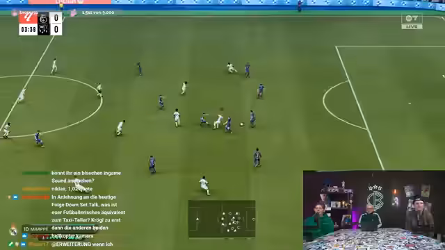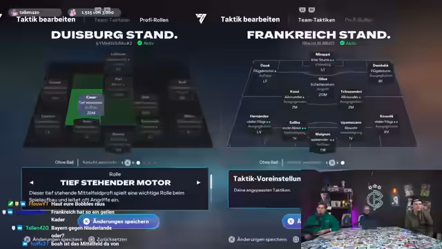 01:54:30Ein neues FIFA-Match beginnt, in dem der Streamer mit MSV Duisburg gegen die französische Nationalmannschaft antritt. Er stellt die Taktik ein und wechselt Spieler, indem er Dembélé von der Stürmerposition auf die Zehner-Position verschiebt. Vor dem Anpfiff tauchen im Chat verschiedene Anekdoten und Begriffe auf, wie 'Eisele Chupago', was zunächst nicht verstanden wird. Der Streamer kommentiert den Start des Spiels und die erste Balleroberung, wobei er sich über die langsame Spielweise der französischen Mannschaft ärgert und die unkoordinierten Aktionen der eigenen Spieler bemängelt.