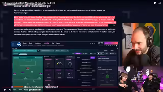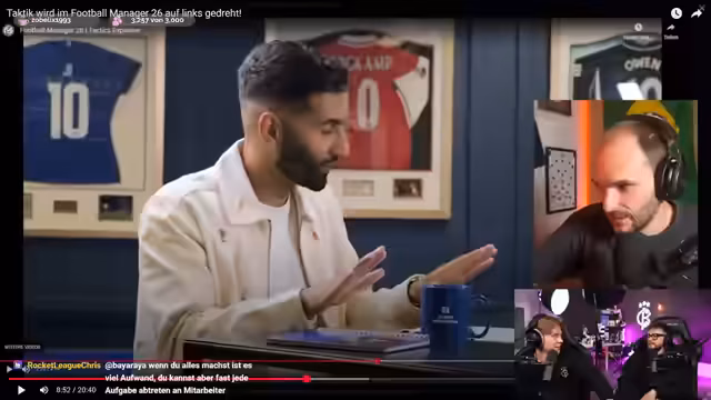 00:12:28Da Länderspielpause herrscht, verzichten die Moderatoren auf Rasenschach und erklären die Reaction auf das FM26-Taktikvideo von FM2er-Kette. Lukas stellt seinen Zwiespalt zwischen Hype und Angst vor dem neuen Football Manager dar, während Kröger seinen grundsätzlichen Enthusiasmus für neue Spiele betont. Beide diskutieren ihre unterschiedlichen Hype-Level und die Bedeutung von Taktik als Kernfeature. Nach kurzer Lautstärkenanpassung starten sie die Reaction auf das Video, das die größte taktische Weiterentwicklung in der FM-Serie vorstellt.