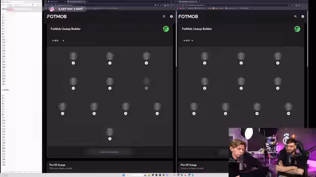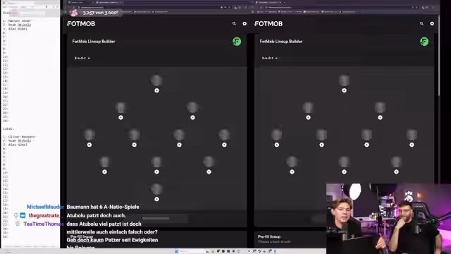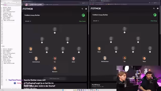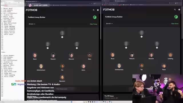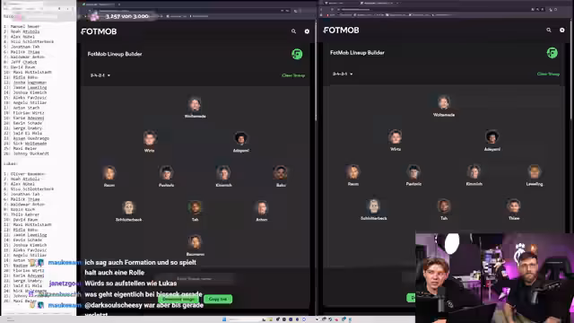 01:02:03Der Streamer und Lukas beginnen ein 'Bundestrainer-Cosplay' von Julian Nagelsmann mit der hypothetischen Idee, einen WM-Kader für ein morgen startendes Turnier zusammenzustellen. Ursprünglich sollte Niklas (Krankheit) dabei sein, Lukas sprang ein. Die Herausforderung: Längere Verletzungen wie Ter Stegen, Rüdiger oder Havertz werden ausgeschlossen, da sie für ein Turnier morgen nicht einsatzbereit wären. Der Kader umfasst 26 Spieler, davon 23 im Spieltagskader, und wird anhand der gewählten Formation (3-4-2-1) ausgesucht.