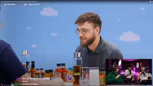 00:15:31Der Gast Nico wird per Splitscreen in den Stream integriert. Nach einer humorvollen und aufwendigen Vorstellung durch Lukas beginnt das eigentliche Format der Sendung: 'Bully-Kartessen'. Hierbei reagiert Nico auf Videos des Formats 'Flamed' von Sabri alias Splashbruder, bei dem man scharfe Saucen isst und dabei provokante Fragen beantworten muss. Parallel wird über einen eigenen Zweitkanal für experimentelle Inhalte informiert.