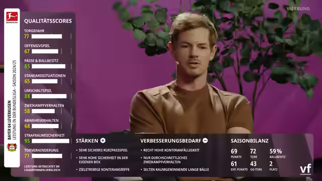 00:49:03Dem VfB Stuttgart werden taktische Schwächen vorgeworfen, insbesondere Pressingfehler bei numerischer Unterlegenheit. Die Entscheidungsfindung der Spieler wird als nicht klug genug bezeichnet, was die Chancen auf einen Top-4-Platz in Frage stellt. Zwar wird der starke Trainer und der nahezu unveränderte Kader gelobt, doch die Abwehr bleibt als größte Baustelle identifiziert.