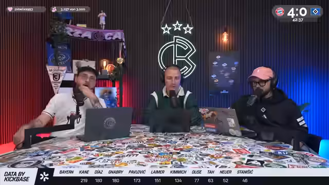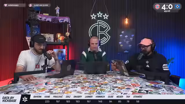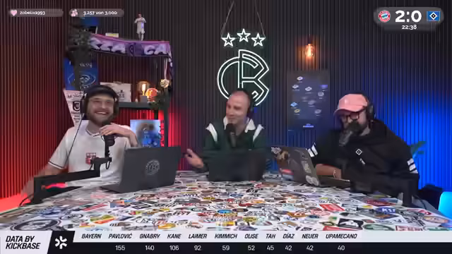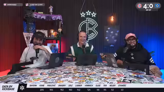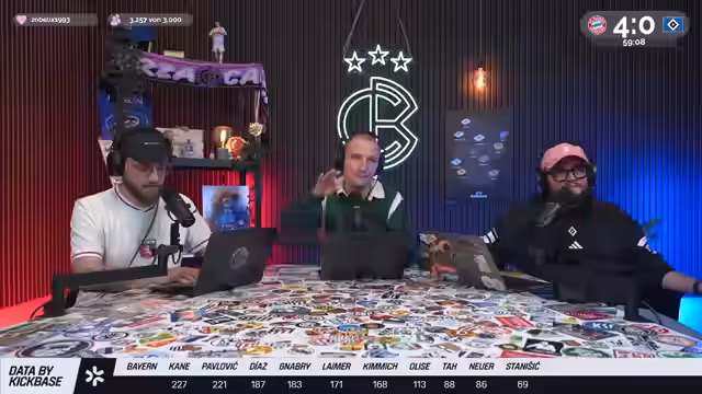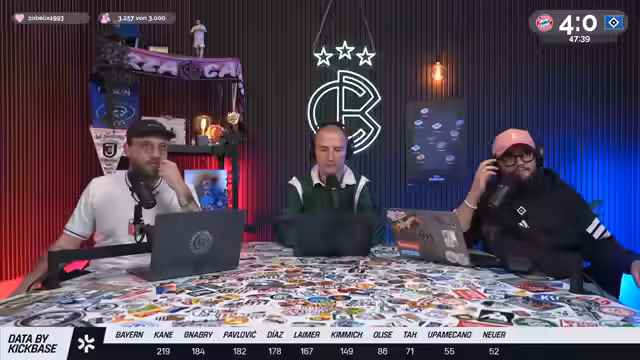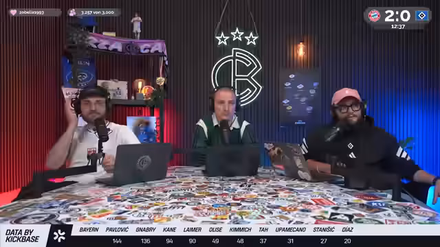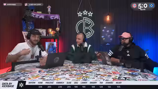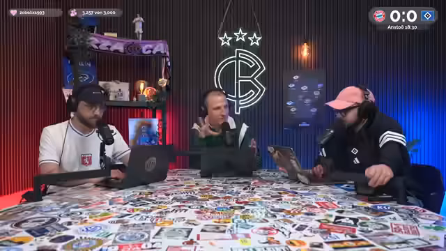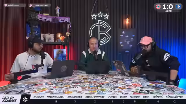 00:05:19Christoph Kröger, Nico Heimer und Niklas Levinson begrüßen die Zuschauer zum Culture Berlin Watchalong des Bundesliga-Topspiels FC Bayern gegen den HSV in der Allianz Arena. Nach langer Zeit ist der HSV wieder zu Gast in München. Es wird über die Erwartungen an das Spiel gesprochen, wobei einräumt wird, dass eine hohe Niederlage gegen Bayern fast schon erwartet wird und zum Selbstverständnis des HSV gehört. Man spricht über die KickBase-Challenge, bei der die Teilnehmer ihre perfekte Aufstellung wählen können, um einen Hauptgewinn zu erzielen. Es werden die Aufstellungen beider Mannschaften analysiert, wobei besonders auf die Debüts von Luka Wuskovic und Fabio Vieira beim HSV eingegangen wird. Man erhofft sich von Vieira Impulse im Offensivspiel des HSV.