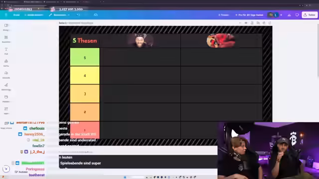 03:48:05Das neue Quizformat 'Wer bietet mehr?' wird als interessant, aber optimierungsbedürftig eingestuft, da die Antwortvergabe unklar war. Das Format 'Fünf Thesen' wird positiver aufgenommen und könnte regelmäßig wiederholt werden. Für die Zukunft werden neue Ideen wie Fußball-Tic-Tac-Toe erwogen. Der Streamer kündigt die 'Tierlist' für Sonntag an und verspricht reg Streams ab Donnerstag.