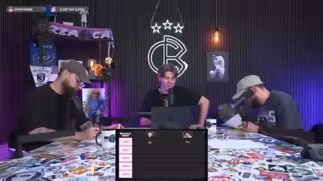 00:48:32Im weiteren Verlauf des Streams geht es um die Präsentation von Preisen für das Tippspiel. Es werden persönliche Andenken wie ein Hut vom Europa-League-Final der Rangers und ein großer Quizkalender gezeigt. Die Dynamik im Studio bleibt locker, mit幽默vollen Ecken wie Lukas' Versuch, Gegenstände aus dem Studio zu verschenken. Der Stream leitet schließlich zur anstehenden Bundesliga-Prognose über, um den thematischen Schwerpunkt auf das eigentliche Fußballgeschehen zurückzubringen.