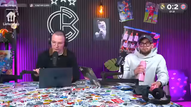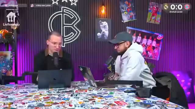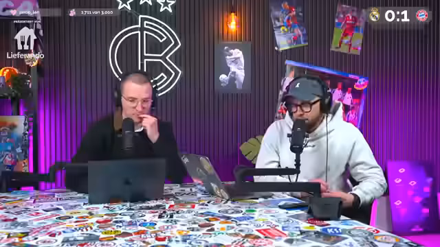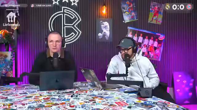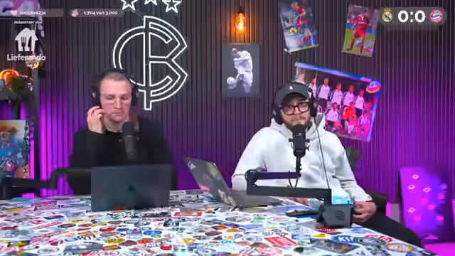 00:00:02Der Stream beginnt mit einer herzlichen Begrüßung zu einem Champions-League-Watchalong der Partie Real Madrid gegen den FC Bayern. Als Partner wird Lieferando vorgestellt, das ein Gutscheinangebot für das Spiel präsentiert. Die Moderatoren, Niklas Levinson und Christoph Kröger, sprechen über das ewige Duell zwischen den beiden Teams und weisen auf ihre gemeinsame Prognose für die Champions-League-Viertelfinale hin, bei der sie sich aufgrund eines Irrtums mit einer Grafik geirrt haben.