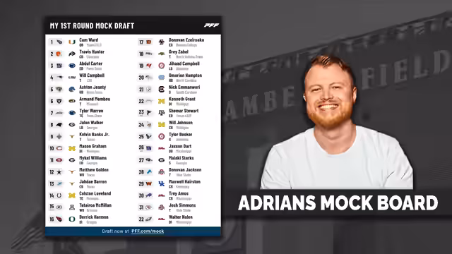 00:22:53Die Moderatoren präsentieren ihre eigenen Mock-Drafts und stimmen in den ersten Picks weitgehend mit der Mehrheit überein: Cam Ward als erster Pick zu den Titans und Travis Hunter als zweiter Pick. Die Überraschung bei Pick zwei ist groß, als die Jaguars tatsächlich nach oben handeln, um Hunter zu wählen. Die Browns profitieren indessen massiv von dem Trade, da sie mehrere Draft-Picks sammeln können. Die ersten Picks werden analysiert, insbesondere Cam Ward wird als guter, aber nicht herausragender Quarterback eingestuft, dessen Entwicklungspotenzial diskutiert wird. Die Picks der Jaguars und Browns werden als strategisch kluge Entscheidungen für beide Teams gewertet, wobei die Jaguars mit Hunter eine spektakuläre Wahl treffen.