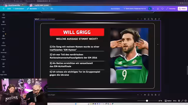 03:00:20Bei der nächsten Frage wird bewusst eine Falschaussage eingebaut. Die Quiz-Teilnehmer sollen über eine Person lügen, die behauptet, im Achtelfinale der EM 2016 ein Tor gegen die Ukraine geschossen zu haben, obwohl er keine einzige Minute im Turnier spielte. Das Quiz wird als unfair und fies eingestuft, da der Teilnehmer nur aufgrund der Behauptung eine Antwort geben muss. Die Entlarvung der Lüge führt zu allgemeinem Erstaunen und einer Diskussion über die Schwierigkeit, solche bewusst falschen Informationen zu erkennen.