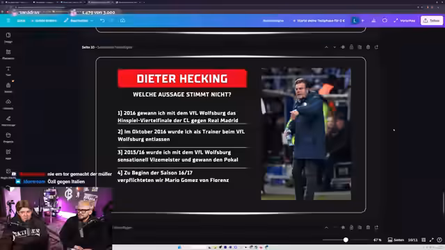 03:03:34Die Diskussion dreht sich um die Fußball-EM 2016. Die Quiz-Teilnehmer müssen erraten, welcher deutsche Offensivspieler in dieser EM ein Tor schoss, jedoch ohne ins Elfmeterschießen zu gehen. Es gibt unterschiedliche Erinnerungen an das Turnier, wie den Wales-Run und das Tor von Dimitri Payet. Eine weitere Frage bezieht sich auf Dieter Hecking, der behauptet, 2016 das Champions-League-Viertelfinale mit Wolfsburg gegen Real Madrid gewonnen und danach den Trainerposten verloren zu haben. Die Glaubwürdigkeit dieser Aussagen wird intensiv diskutiert.
