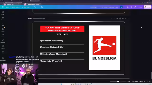 02:27:18Ein besonderer Fokus liegt auf dem Spieler Olysee vom FC Augsburg, dessen offensive Statistiken beeindruckend sind und ihn in vielen Kategorien an die Spitze setzen. Daraufhin wechselt der Streamer das Thema und startet das Quiz "Bundeslügner", bei dem es darum geht, eine falsche Aussage oder Person in einem Satz aus vier Fakten zu identifizieren. Die Fragen drehen sich um Fußball-Themen aus der Saison 2015/16 und erfordern gutes Fachwissen, wobei der Streamer und sein Gegenüber teilweise raten müssen.