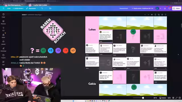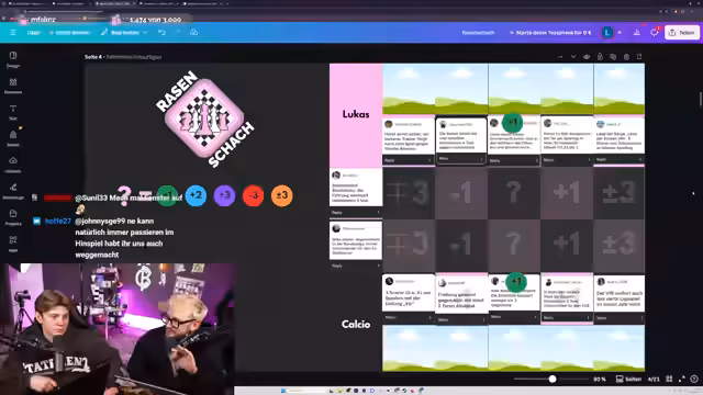 01:35:35Nach dem Geografie-Quiz wechselt der Stream zu Rasenschach, einem Fußball-Quizformat. Es gibt eine Bilanz des 19. Spieltags der Bundesliga, bei dem es 1:1 stand, und Teilnehmer analysieren ihre Gewinne und Verluste, z. B. durch Calimuendos Tor oder die SGE-Bremen-These. Für den 19. Spieltag werden Thesen aus dem gesammelt, z. B. 'Der Bullen sehen rot und schießen mindestens vier Tore gegen Heidenheim' oder 'Horst Steffen wird nach dem Spiel gegen Werder Bremen gefeuert'. Teilnehmer diskutieren die Wahrscheinlichkeiten dieser Thesen und setzen ihre Punkte.