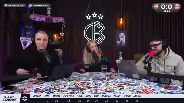 00:15:30Die Aufstellungen beider Mannschaften werden besprochen. Beim VfB stehen Nübel, Wagnmann, Jeltsch, Chabot, Mittelstädt, Kamara, Stiller, Unterrichter, Werner und Endo in der Startaufstellung. Bei Bayern sind Neuer, Davies, Kim, De Ligt, Pavard, Gündoğan, Musiala, Sané, Coman und Kane vorgesehen. Pavlovich ist krank, Pavard steht an seiner Stelle. Es wird über die Form von Sané und das Contract-Gear-Phänomen in der NFL gesprochen. Christoph tippt 2:1 für Stuttgart.