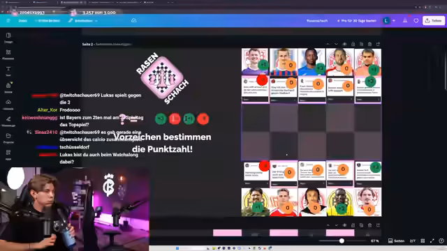 01:31:02Es beginnt die Auswahl der Spieler für das 'Rasenschach'-Team, wobei jeder Teilnehmer abwechselnd Spieler in verschiedenen Kategorien (Dame, König, Torwart, schnellster Spieler, meiste Kilometer) aufstellt. Die strategischen Überlegungen umfassen die Auswahl von Spielern mit hoher Wahrscheinlichkeit für Scorerpunkte oder einer guten Chance auf ein Gegentor. Es wird auch die Form der Spieler und die erwartende Spielweise der jeweiligen Mannschaft berücksichtigt. Die Teilnehmer diskutieren über ihre Wahl und begründen diese, wobei sie auch auf mögliche Kontergelegenheiten, die Schnelligkeit der Spieler und die erwartende Laufleistung eingehen. Es wird auch überlegt, welche Spieler am wahrscheinlichsten die meisten Kilometer abspulen werden, wobei laufintensive Mannschaften und die Spielweise der Gegner berücksichtigt werden. Die Diskussion zeigt, dass die Teilnehmer versuchen, ihre Spieler so auszuwählen, dass sie in ihren jeweiligen Kategorien möglichst viele Punkte erzielen.