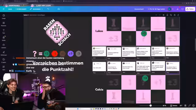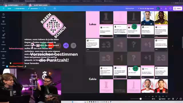 01:50:37Bei der Auswahl des Spielers mit den meisten Kilometern gibt es Probleme, da einer der Kandidaten möglicherweise angeschlagen ist. Es entbrennt eine Diskussion darüber, ob die Wahl geändert werden darf, und die Community wird per Abstimmung um ihre Meinung gebeten. Der Chat entscheidet sich gegen eine Änderung, was zu Frustration führt. Es wird auch über die Punktverteilung im Spiel diskutiert, insbesondere ob Torschützen nicht zu gering bewertet werden. Es wird angeregt, die Punktzahl für einen Hattrick zu erhöhen, um die Leistung der Spieler besser widerzuspiegeln. Die Teilnehmer sind offen für Anpassungen des Formats und wollen die Meinungen der Community berücksichtigen. Trotz der Probleme bei der Spielerauswahl bleibt die Stimmung positiv und die Teilnehmer freuen sich auf den kommenden Spieltag.