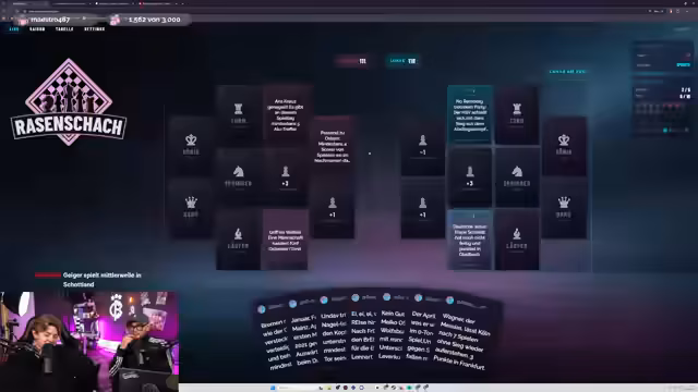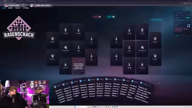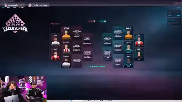 01:35:08Das Rasenschach-Spiel beginnt mit der Phase des Spieler-Drafts, bei der der Streamer seine Tipps für verschiedene Kategorien eingibt. Es kommt zu technischen Unstimmigkeiten bei der Eingabe, da ein Punkt zunächst falsch gesetzt und später korrigiert wird. Der Streamer entscheidet sich für Picks wie Oliver Diemen als Läufer und König Dennis Undorf, wobei er eine Double-Down-Strategie auf Leverkusen anwendet, um Punkte zu maximieren. Seine Wahl für den Torwart Moritz Nikolas gegen Heidenheim basiert auf dessen steter Leistung ohne Gegentore. Des Weiteren wird Basumana Touré als Läufer mit den meisten Sprints ausgewählt, was auf eine datenbasierte Entscheidung hindeutet. Für die König- und Dame-Kategorie trifft er die Wahl auf Ibo Masa und Luis Diaz, wobei letzterer aufgrund von Ausfällen im Kader als wahrscheinlich angesehen wird.