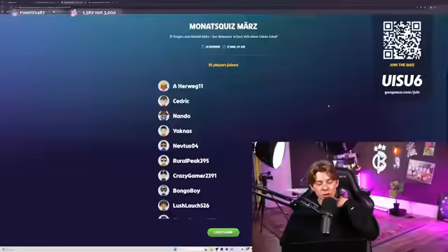 01:47:44Der Stream wird von Scalable Capital gesponsert, was in den Chat mitgeteilt wird. Im Anschluss daran geht es in das Monatsquiz, bei dem der Kaltshow-Schal als Hauptgewinn ausgelobt wird. Der Zugang zum Quiz erfolgt über die Plattform Geoguesser, für die ein eigener Account benötigt wird. Der Code UISU6 wird für den beigetretenen Countdown freigegeben und der Streamer motiviert die Zuschauer, den Kreis der Teilnehmer auf 60 oder mehr zu erweitern. Nach technischen Startschwierigkeiten, die durch das erneute Einsenden des Links gelöst werden, startet das Quiz schließlich mit 84 Teilnehmern. Fragen, die ersteigeholt wurden, betreffen den Ex-Coach des VfL Wolfsburg und die Anzahl der Scorer von Dennis Undav im März.