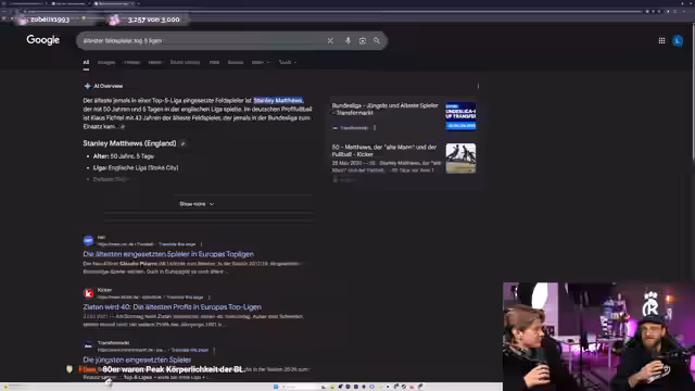 01:17:44Der Stream weicht kurz vom Thema Shooting Stars ab, um über außergewöhnliche Karriereverlängerungen und das Ende von Epochen zu sprechen. Dabei werden Luka Modric, der mit 40 noch in Mailand spielt, und Dante besprochen, der gerade der älteste Feldspieler in der Geschichte der Europa League wurde. Gleichzeitig findet eine Diskussion darüber statt, wie Fußballer im hohen Alter altern und welche Strategien sie anwenden, um ihre Athletik und Langlebigkeit zu erhalten.