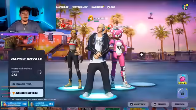 00:06:14Nach der Einrichtung der technischen Grundlagen konzentriert sich der Streamer darauf, sein Fortnite-Team zusammenzustellen. Spieler wie Melissa und Sam werden auf Discord angesprochen und ins Spiel eingeladen. Der Modus Battle Royale wird gewählt, um gemeinsam zu spielen. Die erste Landezone wird ausgewählt und das Spiel beginnt. Zu Beginn der Runde werden erste Gegner gesichtet, was zu den ersten Gefechten und der ersten Eliminierung führt, wobei das Team zusammengearbeitet hat, um den Gegner zu eliminieren.