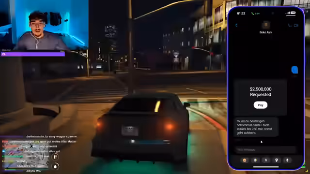 02:25:46Im GTA-Teil des Streams finden zahlreiche Interaktionen mit anderen Spielern statt. Der Streamer streitet sich mit einem anderen Charakter namens Beko über Geld, Drohungen und familiäre Zugehörigkeiten. Er versucht, durch Autorität und Drohungen seine Position zu festigen, während er gleichzeitig versucht, Geld durch Überfälle und Erpressungen zu beschaffen. Die Szene ist geprägt von aggressivem Verhalten und dem Versuch, soziale Dominanz im Spiel auszuüben.