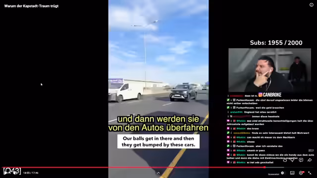 00:10:54Der Streamer erzählt von einem Vorfall in seiner Siedlung, bei dem eine andere Autofahrerin ihn beleidigte. Das Geschehen ereignete sich im Zusammenhang mit dem Einhalten einer Einbahnstraßenregel. Die Frau blockierte den Weg, was der Streamer als bewusste Provokation ansah, und beschimpfte ihn als 'Kanacke'. Es kam zu einer hitzigen Konfrontation, bei der der Streamer die Frau an ihrem Kennzeichen erinnerte und behauptete, sie habe mit über 70 km/h durch eine 30er-Zone gefahren.