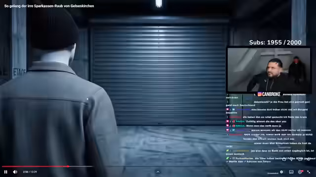 02:14:00Der Stream thematisiert plötzlich den größten Bankraub der deutschen Geschichte in Gelsenkirchen. Er beschreibt den Detailgrad des Überfalls, bei dem Täter gezielt einen Tunnel unter der Sparkasse nutzten. Es wird ein Insider-Job vermutet, da die Diebe professionelle Methoden und spezielle Kenntnisse über die Sicherheitssysteme und Mitarbeiter-Codes besaßen.